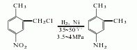 2、其制備方法是以對硝基甲苯為原料進行氯甲基化再加氫還原脫氯而制得。在反應釜內加入二氯甲醚、對硝基甲苯、氯磺酸,于15~20℃攪拌反應后,再經水解、過濾,濾餅洗滌得2-氯甲基-4-硝基甲苯,將2-氯甲基-4-硝基甲苯溶于乙醇中,加蘭尼鎳,先通氮氣取代反應器內的空氣,然后通氫氣,控制溫度35~50℃,壓力3.4~3.9 mpa,通氫氣完畢,蒸餾回收乙醇后,加氫氧化鈉堿化,再以水蒸氣蒸餾得成品。